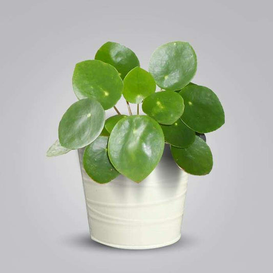 Pilea Peperomioides with White Metal Pot