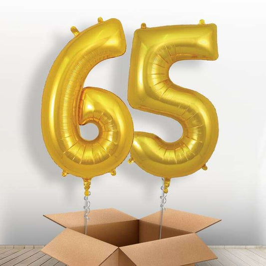 65th Birthday Balloons in a Box - Gold Numbers