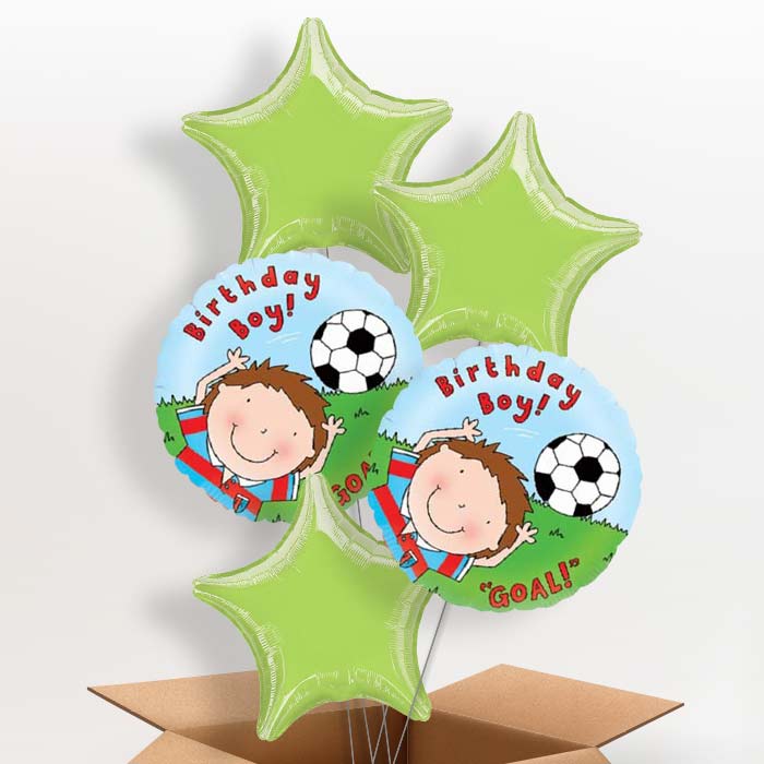 Our balloon in a box can have personalised text added to it and the balloons "Birthday Boy" text alongside a boy playing football in a field. It makes a great birthday surprise and the perfect ready to use balloon display for your party - ready to go out of the box and your guests are sure to love it!