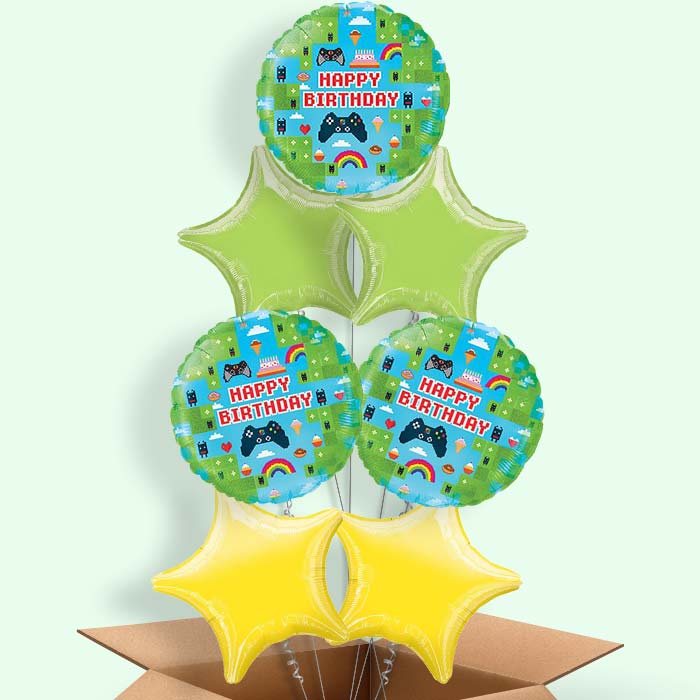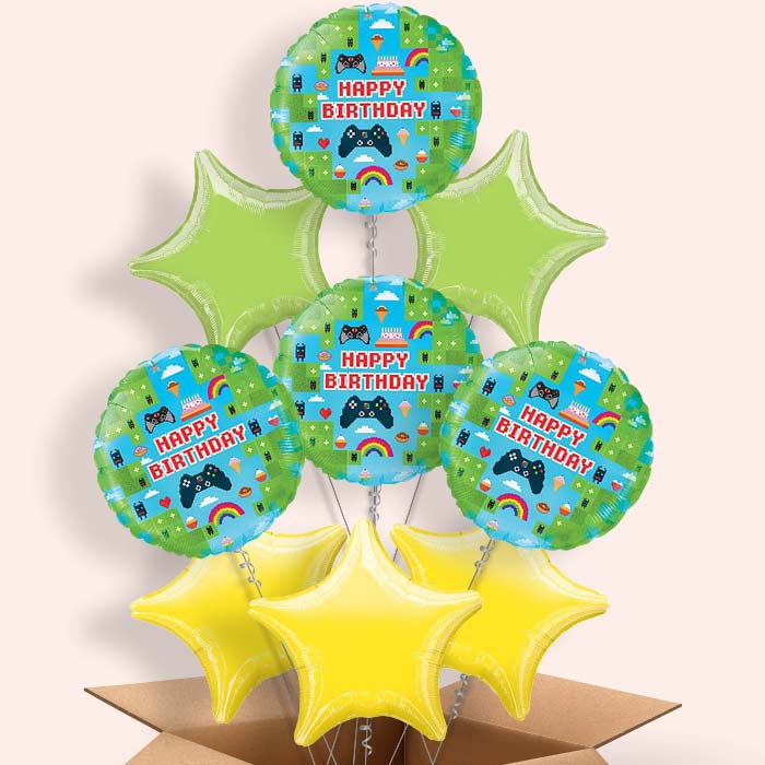 An epic Gaming Birthday Balloons in a Box - Game Blox surprise featuring a bright "Happy Birthday" design with gaming icons.