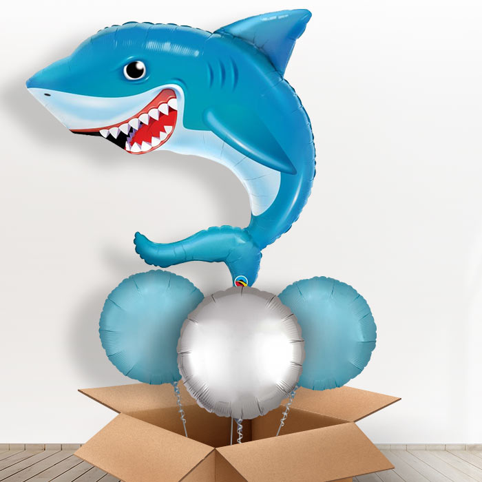A jaw-some Shark Balloon in a Box featuring a Smiling shark design.