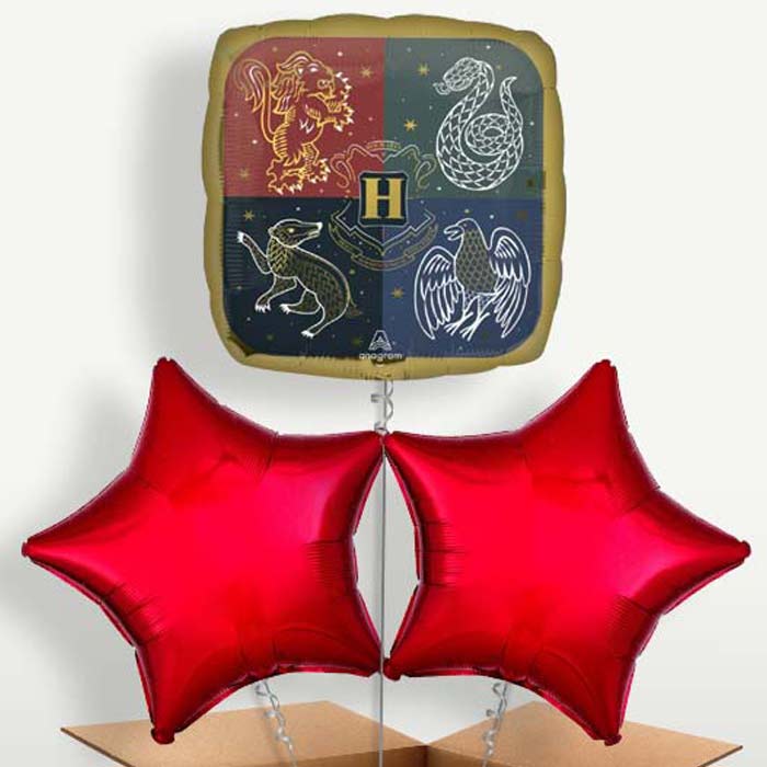 Add some character magic to your celebration with Harry Potter Hogwarts Crest Balloons in a Bunch. This balloon arrangement has a featured design balloon on top with 2 plain coloured balloons underneath.