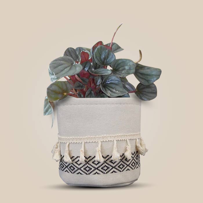 A Peperomia Caperata House Plant supplied in peat free soil, 13cm nursery pot and accompanied by a decorative plant pot.
