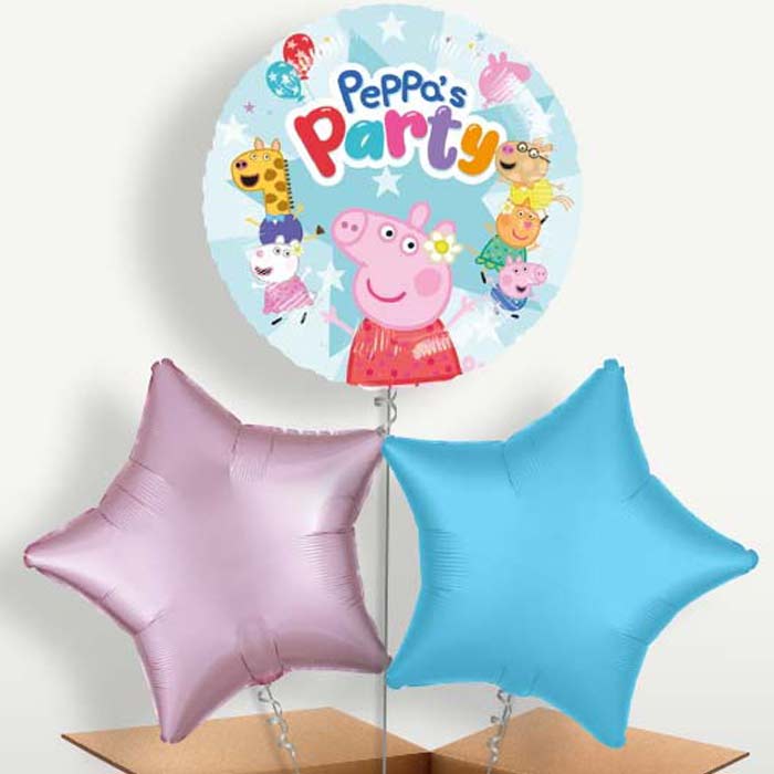 Unleash the magic of their favourite character with Peppa Pig & Pals Balloon Bunch inflated with Helium. This balloon arrangement has a featured design balloon on top with 2 plain coloured balloons underneath.