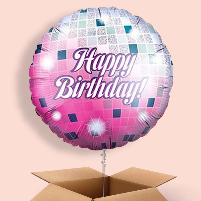 A great Pink Birthday Disco Ball Helium Balloon in a Box birthday surprise featuring a disco ball inspired print.