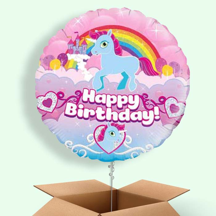 A lovely Rainbow Unicorn Birthday Balloons in a Box surprise featuring a colourful unicorn design.