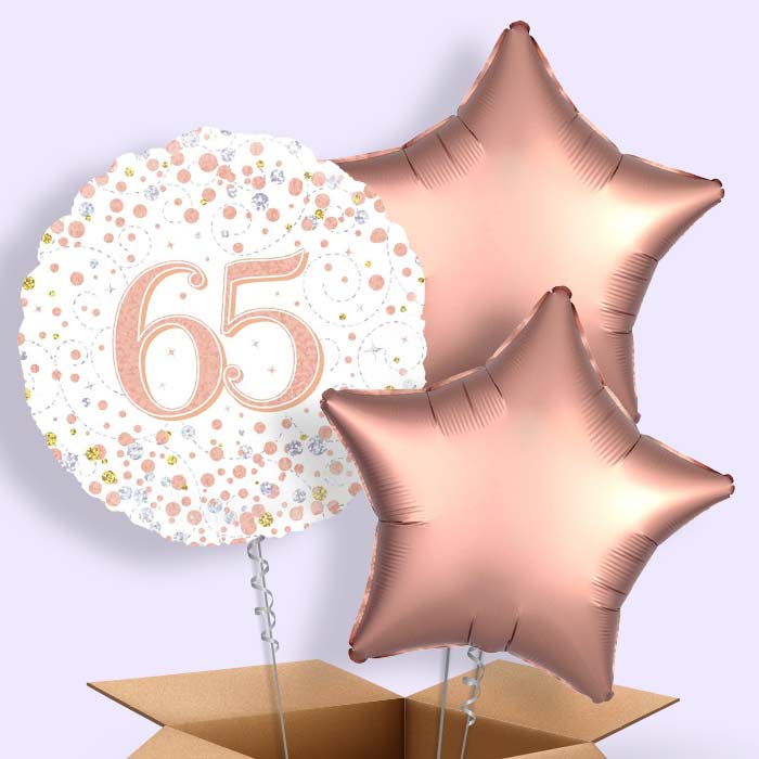 On trend and shimmering, you are sure to send a stylish birthday wish with our White and Rose Gold 65th Birthday Balloons, they make a great gift, table centrepiece and party decoration.