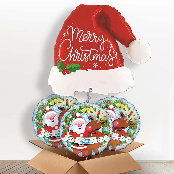 A great Santa Hat Merry Christmas Balloon in a Box featuring Santa hat design.