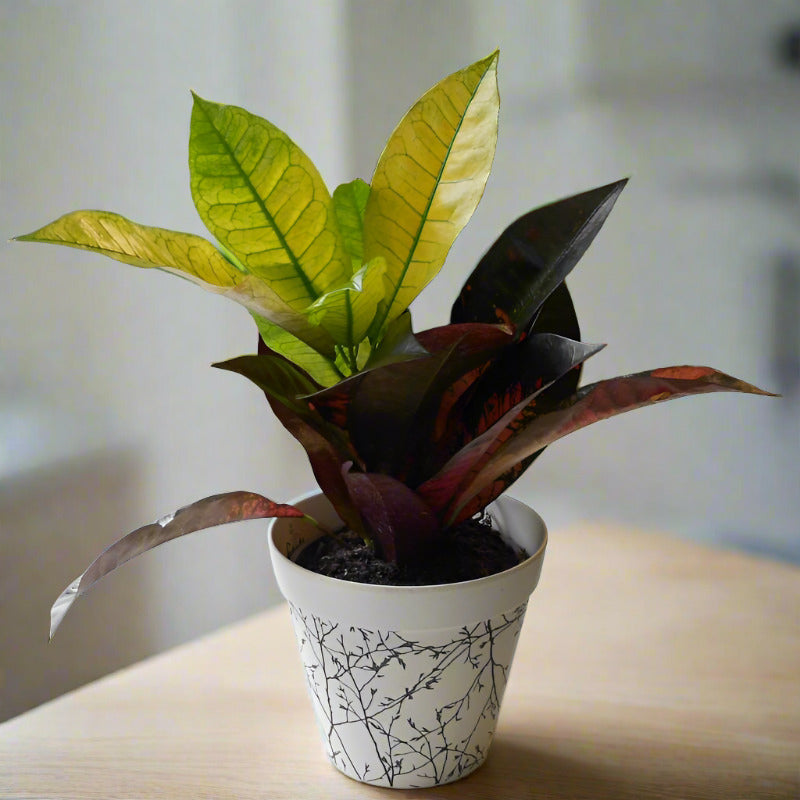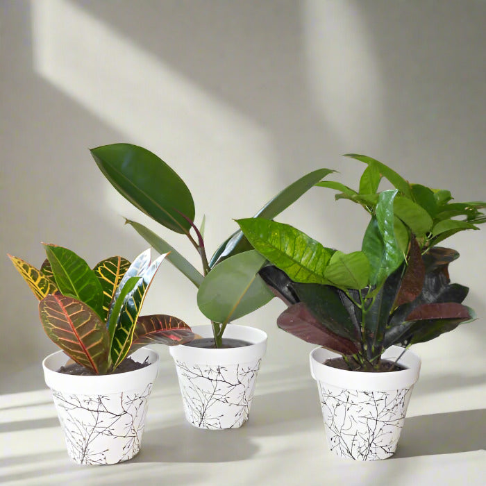 Our Set of 3 Houseplants that Love Sun with Pots includes a Ficus Rubber plant and 2 x Croton plants with 3 stylish bamboo plant pots so that they look great wherever you place them!