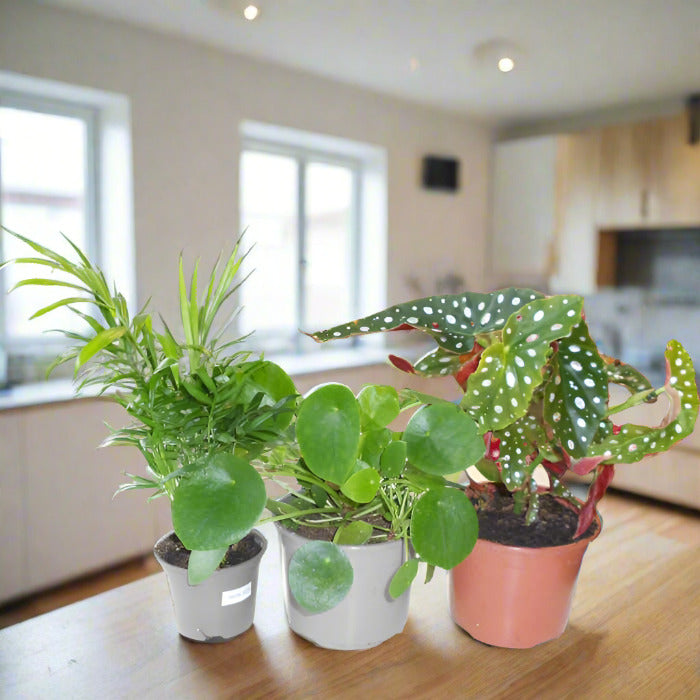 Our Set of 3 Indoor Plants For Teachers includes a Money plant, Polka Dot Begonia Maculata plant and a Parlour Palm plant. 2 plants are supplied in a 9cm nursery pot, 1 is supplied in a 13cm nursery pot.