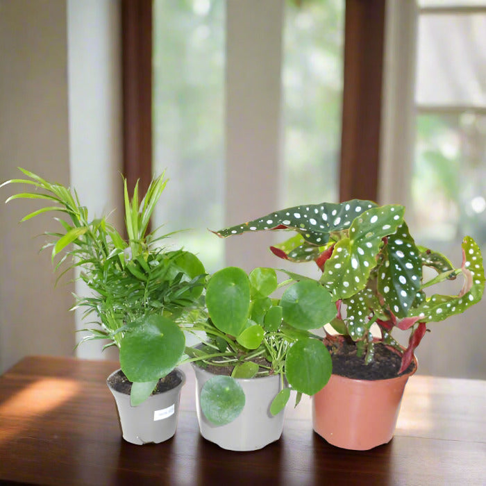 Our 3 Good Luck Indoor Plants includes a Money plant, Polka Dot Begonia Maculata plant and a Parlour Palm plant. Two plants are supplied in 9cm nursery pots, one is supplied in a 13cm nursery pot.