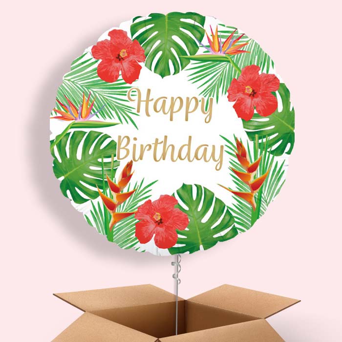 Tropical Flowers Happy Birthday Foil Helium Balloon in a Box Gift.