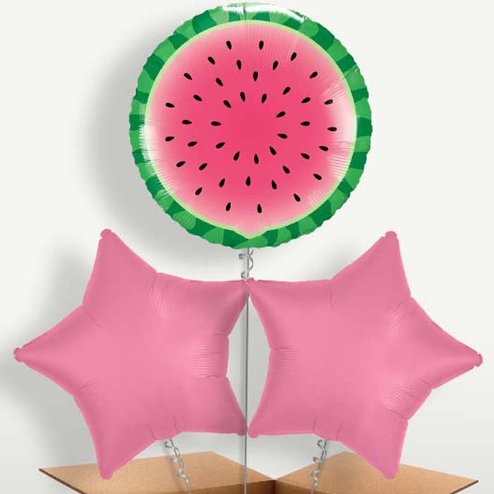 Celebrate in style with Watermelon Helium Bunch of Balloons. This balloon arrangement has a featured design balloon on top with 2 plain coloured balloons underneath.